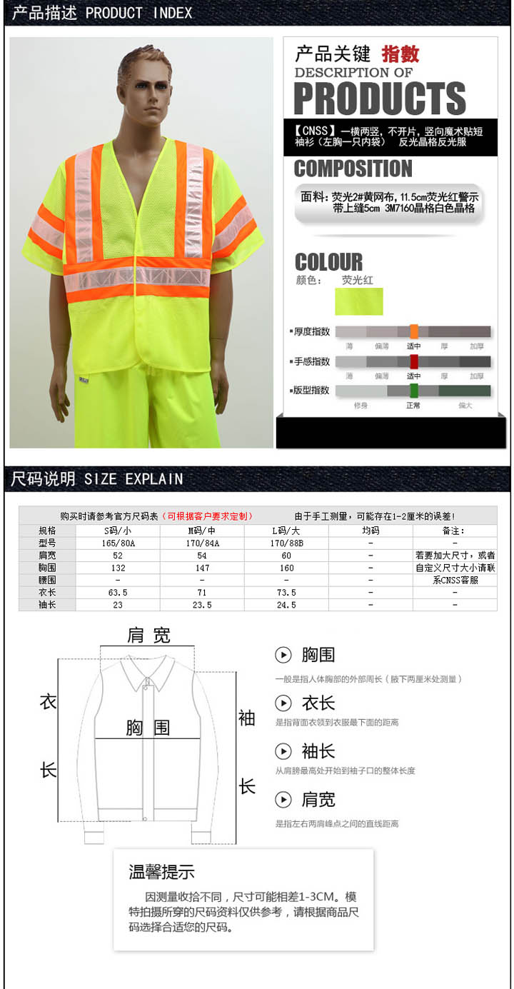 4.結(jié)構(gòu)簡單,穿著方便,高亮度。適用于道路施工、清掃環(huán)衛(wèi)、加油站及停車場等場合的工作人員。