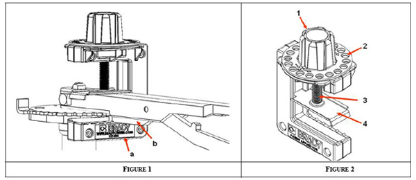 2. 把閉鎖裝置的軸心(圖2-3)對(duì)準(zhǔn)把手的中心,順時(shí)針轉(zhuǎn)動(dòng)鎖具凸緣的旋鈕(圖2-1)來(lái)降低壓板