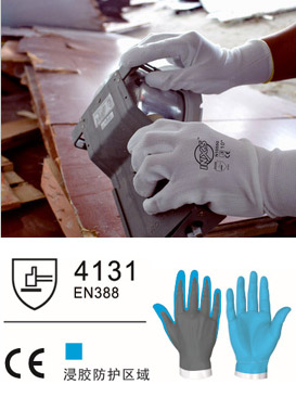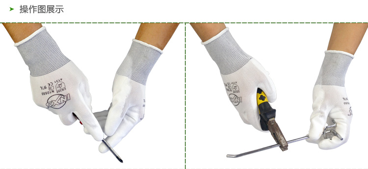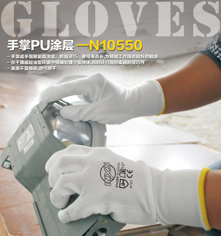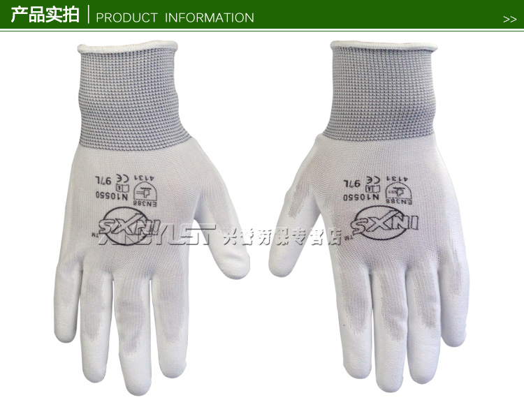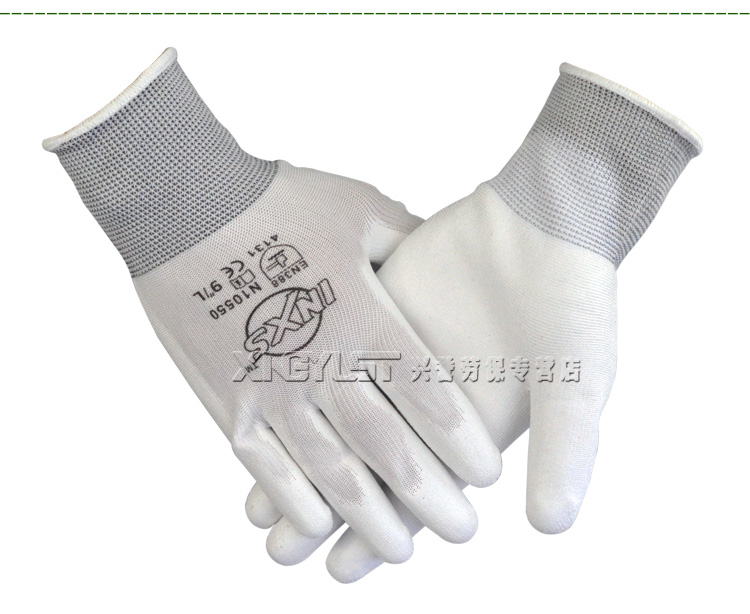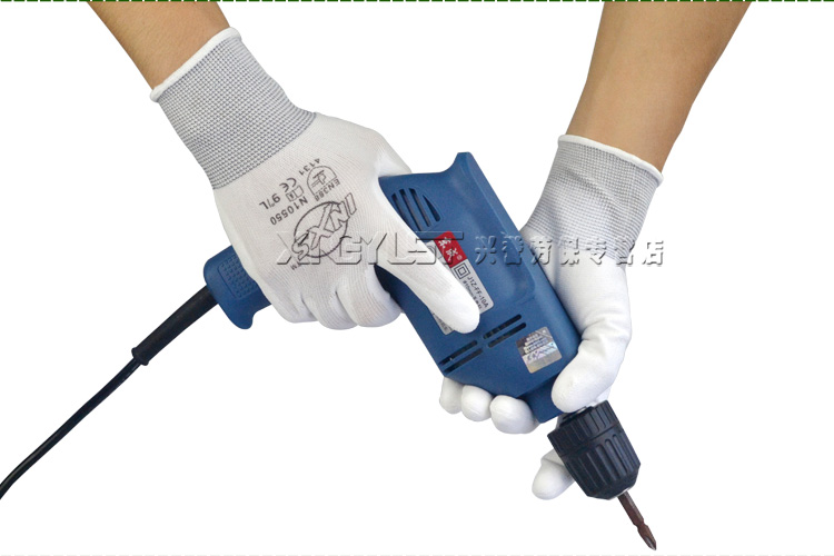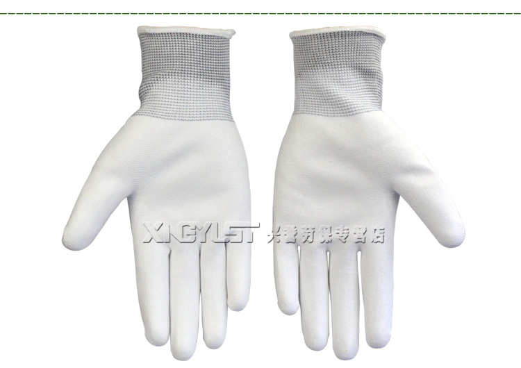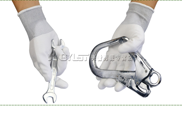 -13針白色復(fù)合絲針織手套手掌浸白色聚氨酯涂層,抓握力好,