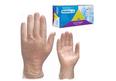 帶粉乙烯基一次性防護(hù)手套,乙烯基材質(zhì),搽有玉米淀粉,穿脫方便。通過食品安全認(rèn)證,可與食物接觸。