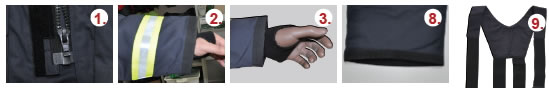 4、袖口由進(jìn)口阻燃氯丁橡膠涂覆材料包邊,耐磨耐用,里層設(shè)有止水布,防止袖口遇水發(fā)生虹吸現(xiàn)象