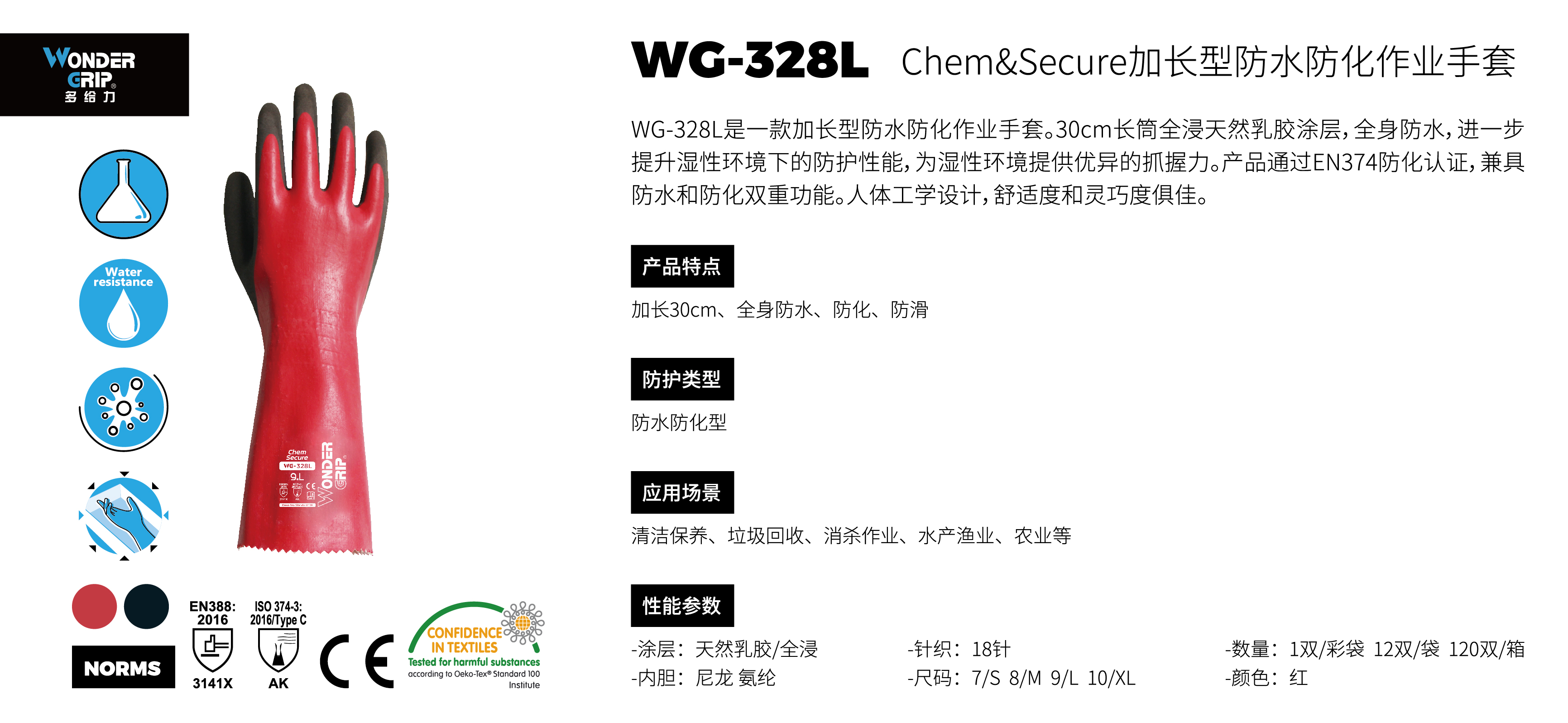 產品名稱:多給力 WG-328L 全浸防水型作業(yè)手套 產品描述: 具有良好的防滑效果; 對甲醛等化學溶劑具有一定的防滲透效果; 加長長筒全浸膠技術; 推薦行業(yè): 清潔保養(yǎng),垃圾回收,消殺作業(yè),水產漁業(yè),農業(yè);