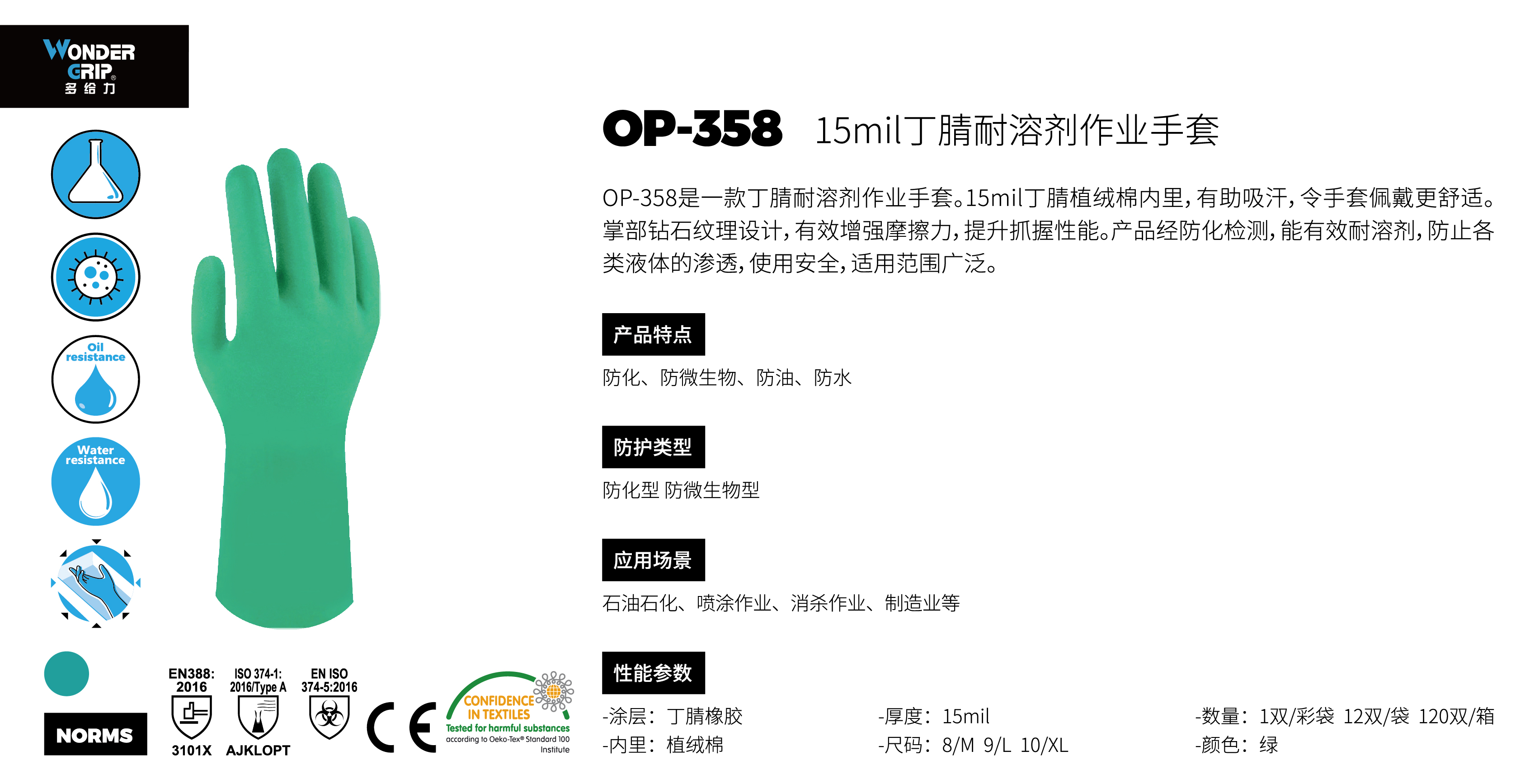 產(chǎn)品名稱:多給力 OP-358 丁腈耐溶劑作業(yè)手套防化手套 產(chǎn)品描述: 丁腈絨棉內(nèi)里,有助吸汗,手套佩戴更舒適; 掌部鉆石紋理設計,有效增強摩擦力,提升抓握性能; 有效耐溶劑,防止各類液體的滲透; 推薦行業(yè): 石油化工、精細化工、化學處理、汽車組裝等