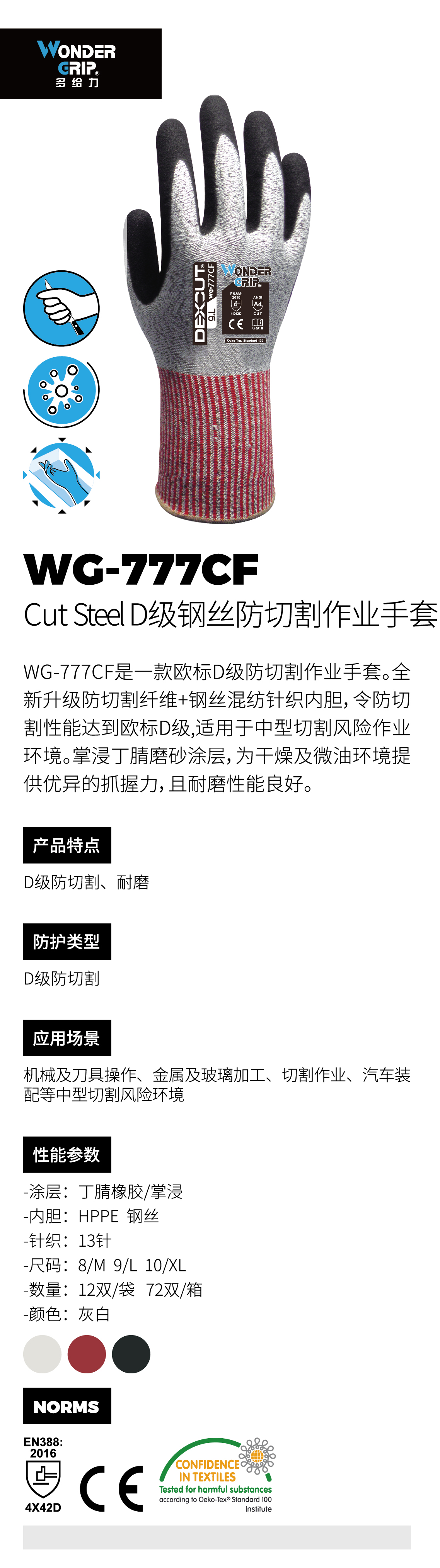 產(chǎn)品名稱:多給力 WG-777CF 加厚5級防切割耐磨機械金屬玻璃手套