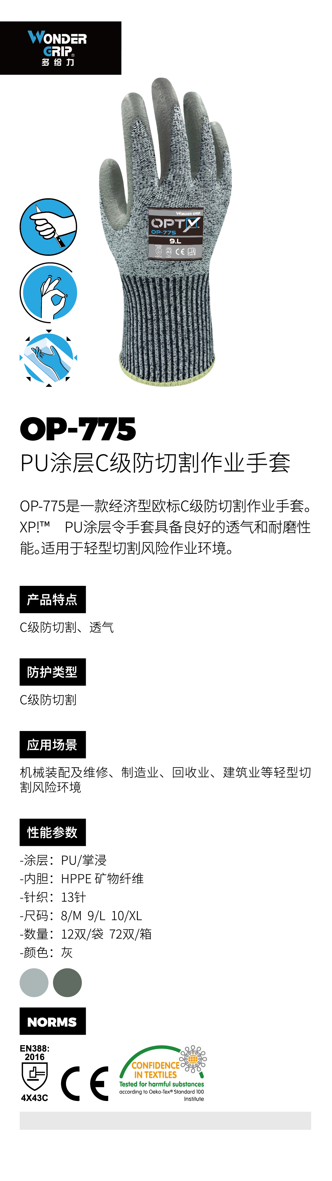 產(chǎn)品名稱:多給力 OP-775 PU涂層3級防切割手套